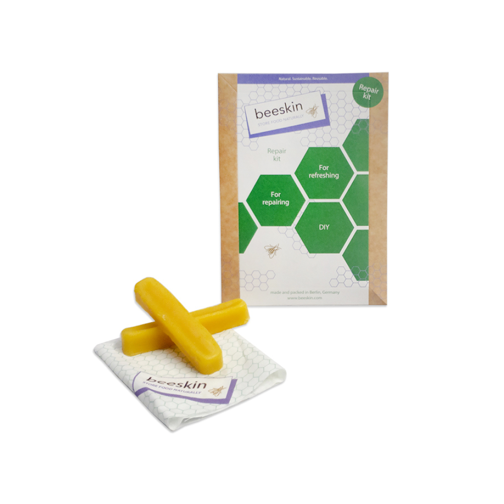 Uw Beeskin kan met de juiste zorg tot 1 jaar hergebruikt worden. Als het niet meer goed plakt of een beetje gebreken heeft, kunt u het gewoon thuis opfrissen. Natuurlijk kunt u onze reparatieset ook gebruiken om uw eigen bijenwasverpakkingen te maken. Zorg er wel voor dat je stoffen gebruikt die biologisch gecertificeerd zijn. De kit bevat 40 g bieeskin mengsel.