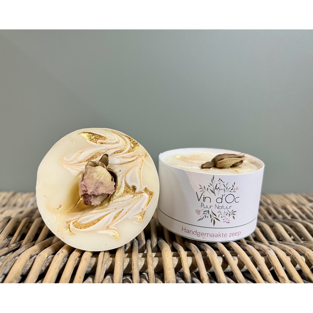 Gold Rose! Wauw…Een mooie wit met goud gecombineerde zeep. Met boven op: een prachtige rozenknop! Dit zeepje ruikt naar rozen! ????