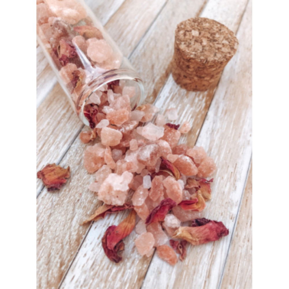 Een prachtig glazen flesje gevuld met himalaya badzout. Aan dit badzout zijn gedroogde rozenblaadjes toegevoegd. Heerlijk voor in je bad of mooi ter decoratie!
