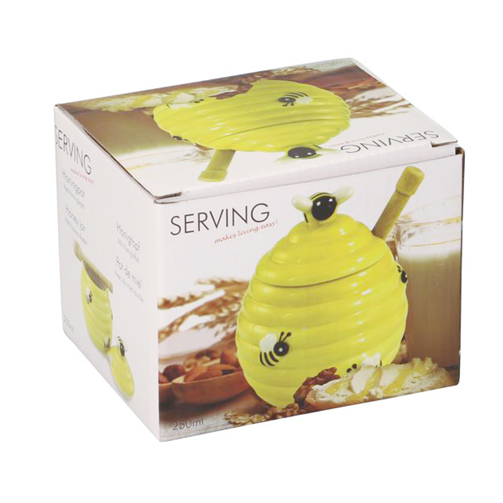 Breng sfeer en gezelligheid in je keuken met deze gele keramische honingpot, afgewerkt met een speels 3D-bijenmotief. Niet alleen handig om honing netjes te serveren, maar ook een echte blikvanger op tafel.