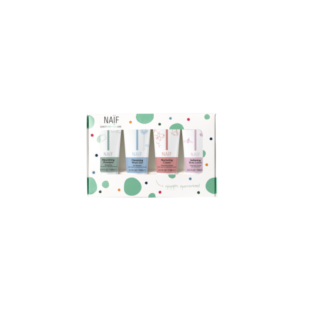 De Naïf Mini Set met verzorgingsproducten voor je kindje is ideaal om mee te nemen wanneer je op reis gaat. Ook is het leuk om weg te geven als kraamcadeau. De set bevat een verzachtende baby bodylotion, voedende shampoo, reinigende baby wasgel en verzorgende crème. De producten zijn in een klein formaat.