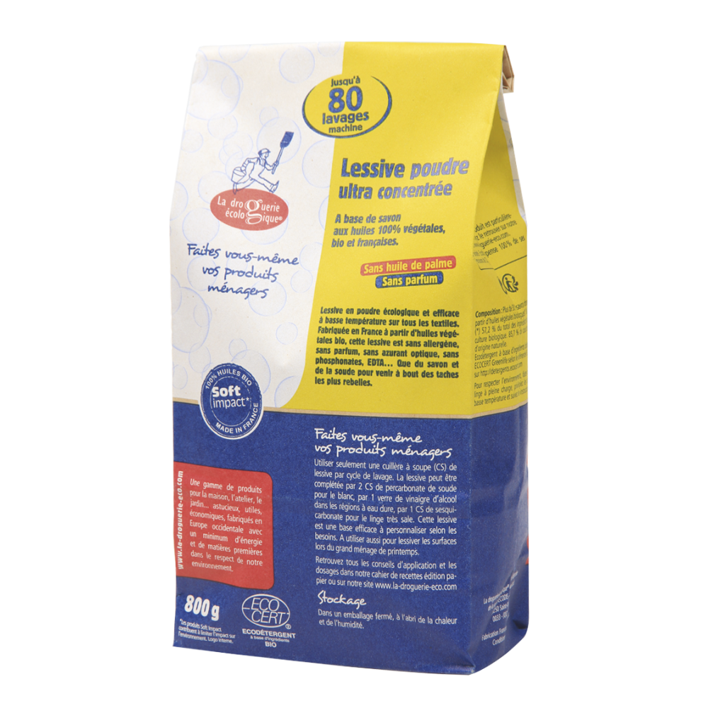 Dit supergeconcentreerde waspoeder is biologisch afbreekbaar en werkzaam bij alle temperaturen en textielsoorten. Het wordt in Frankrijk gemaakt van biologische plantaardige oliën. Dit waspoeder is vrij van allergenen, geurstoffen, optisch bleekmiddel en fosfonaten. Het bevat alleen zeep en soda, en verwijderd zo de hardnekkigste vlekken.