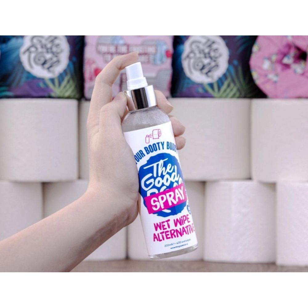 Maak van gewoon toiletpapier eenvoudig een verzorgende, vochtige wipe met de 100% natuurlijke Booty Buddy Spray van The Good Roll. Milieuvriendelijk, huidvriendelijk én superhandig voor thuis of onderweg.