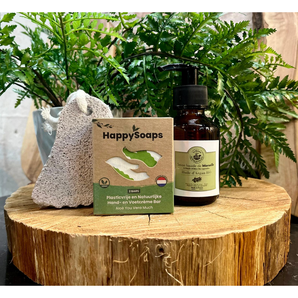 - En een verzorgende hand- en voetencrème bar met aloë vera van HappySoaps.