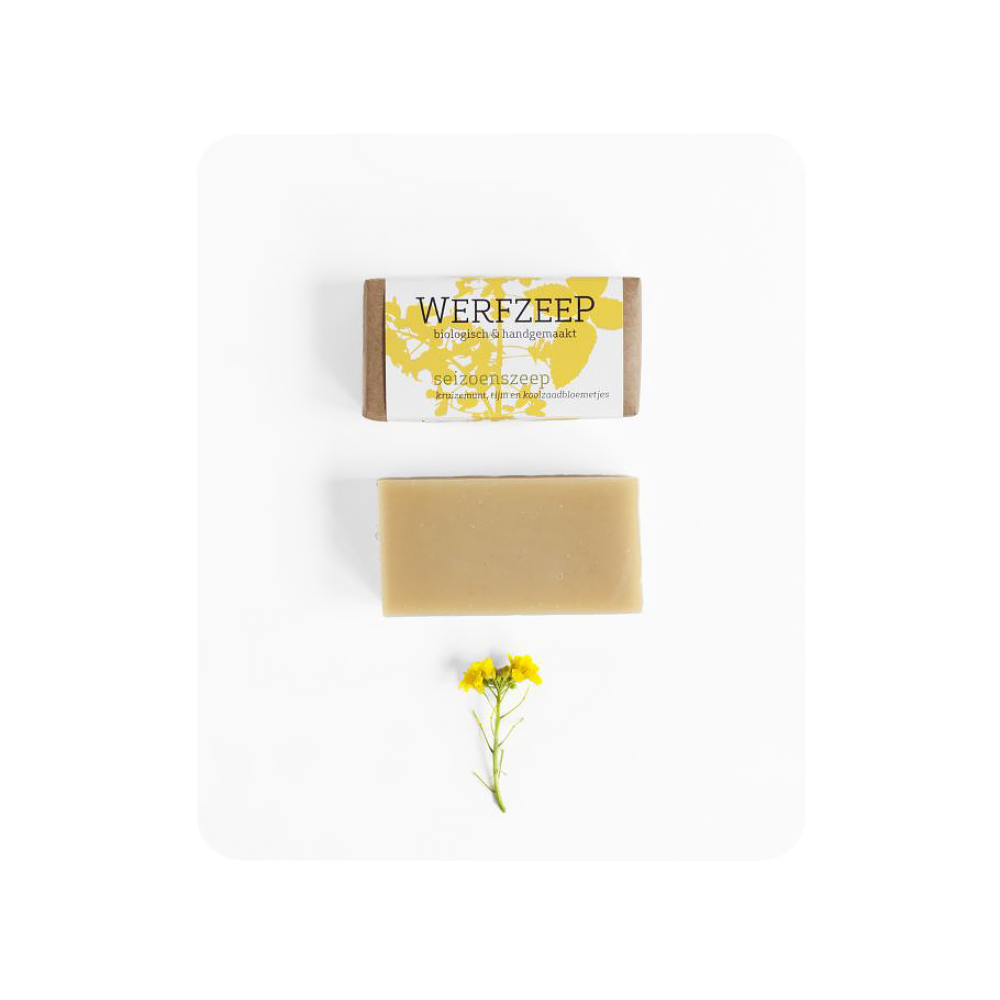 Het is een lekker frisse lentezeep geworden met kruizemunt, tijm, citroen, rozemarijn en dus koolzaadbloemetjes.